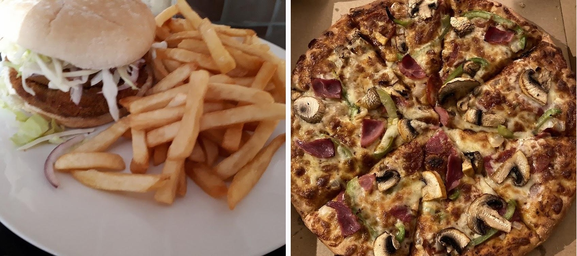 Must-try items include the crispy cheese and tomato pizzas, cheesy garlic bread, and the succulent burgers.